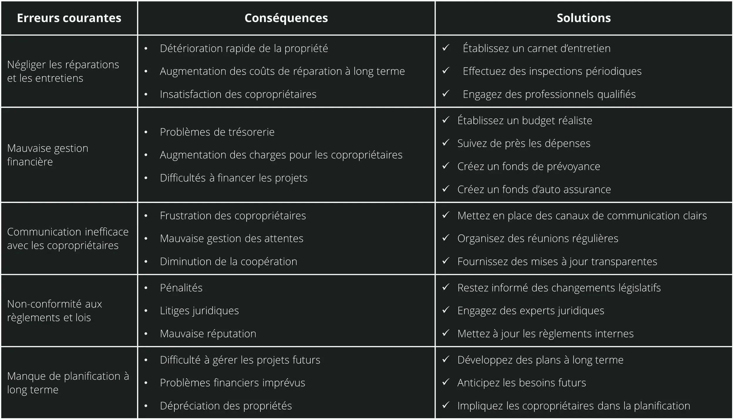 Pour vous aider à mieux visualiser ces erreurs et leurs solutions, nous avons préparé un tableau récapitulatif. Ce tableau vous permettra de voir rapidement les principales erreurs, leurs conséquences, et les solutions recommandées pour y remédier. Nous espérons que cet outil vous sera utile pour optimiser la gestion de votre copropriété.